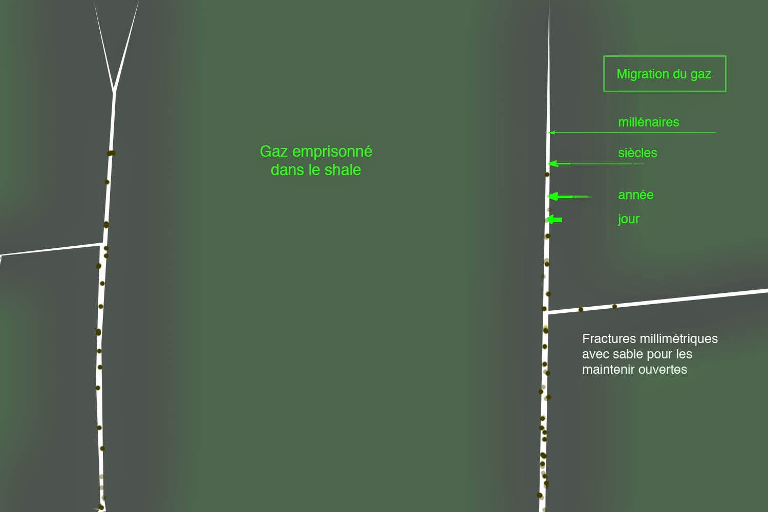 La figure suivante illustre, grandeur nature, les temps de migration du gaz dans le shale resté intact entre les fractures, après les opérations de fracturation. On constate que le gaz va prendre des millénaire à parcourir des distances de quelques centimètres.