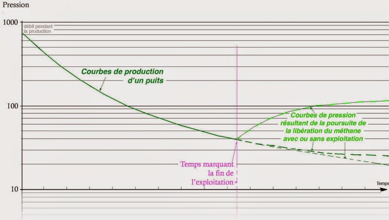 Ce phénomène se répercute sur les débits de production des puits. Le débit décroit de manière exponentielle après la mise en service du puits. À l’intérieur d’au plus quelques années, le puits atteint le seuil au-delà duquel la production n’est plus rentable. À ce moment, on ferme le puits. La migration des gaz, elle, se poursuit pou les millénaires qui suivent, augmentant la pression graduellement sur la structure. « Ce phénomène sera autrement plus significatif dans les puits horizontaux avec fracturation hydraulique que dans d’autres types de puits.«